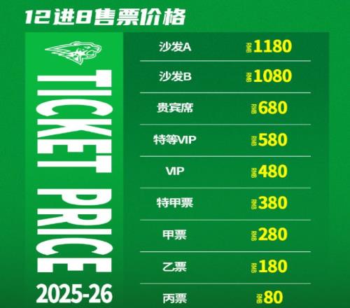 首先,遼籃季后賽首輪主場的門票一共分為9檔,其中沙發(fā)(A座)的票價為1180元,沙發(fā)(B座)為1080元,貴賓席的票價為680元,特等VIP票為580,VIP票為480元,特甲票為380元,甲票為280元,乙票為180元,丙票為80元。