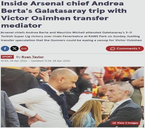 鏡報記者RT消息,阿森納體育總監貝爾塔和人員招募主管米凱利近日出現在了加拉塔薩雷對費內巴切的伊斯坦布爾德比現場,而他們倆是轉會斡旋者兼經紀人喬治-加爾迪邀請的客人。